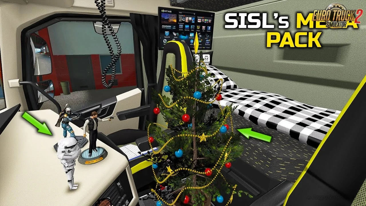 โจ SiSLs Mega Pack for ETS2 - this mod contains over 400+ cabin accessory items suitable for your taste, bringing female and male co-drivers, bobbleheads, accessories for truck driver needs, snacks, electronic devices, computers and tablets, lots of scarves, fresheners, toys and many many more. This mod is for lovers of decorating the interior of the truck. The new add-on expands the capabilities of the official DLC Cabin Accessories add-on and adds new objects to the game that can be installed in the interior of Euro Truck Simulator 2 trucks.