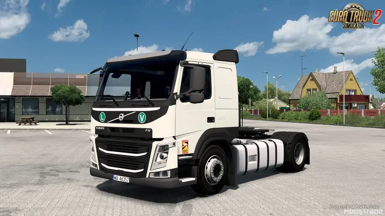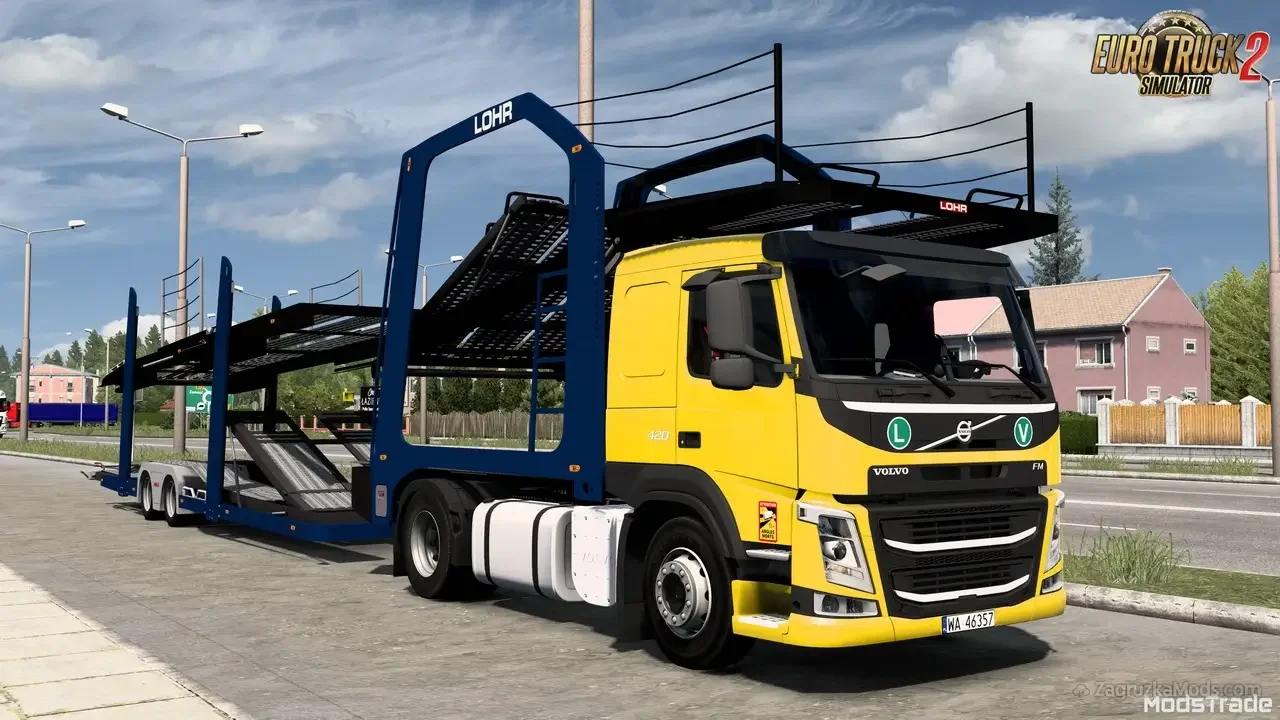 Volvo FM4 Megamod for ETS2 - is a fully autonomous truck mod that replicates the Volvo FM4 series with a focus on versatility and customization. It features multiple cab and chassis options, a car transporter trailer, and a range of aesthetic and functional upgrades. The mod is designed to enhance immersion with working animations, new shadows, and a full lightmask.