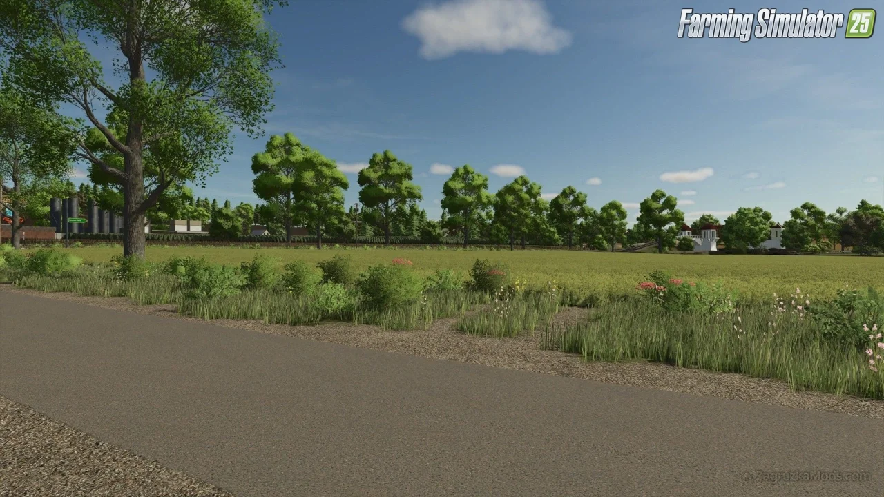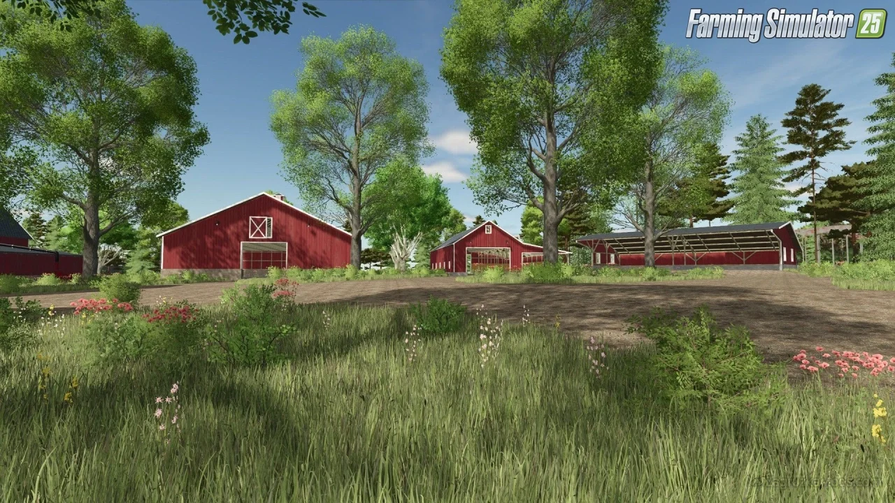 Amever Farm Map for FS25 - set in the fictional American-style village of Creek Hollow, this medium-sized map features rolling hills, dense forests, and a rich backstory involving a fertile farm and a mysterious past tied to a lucrative mine. The map supports precision farming, includes pre-installed AutoDrive courses, and features a custom ferry, train system, and iron mine for metal production. Itโs ideal for players seeking a mix of traditional farming, specialized crops, and adventurous elements on maps.