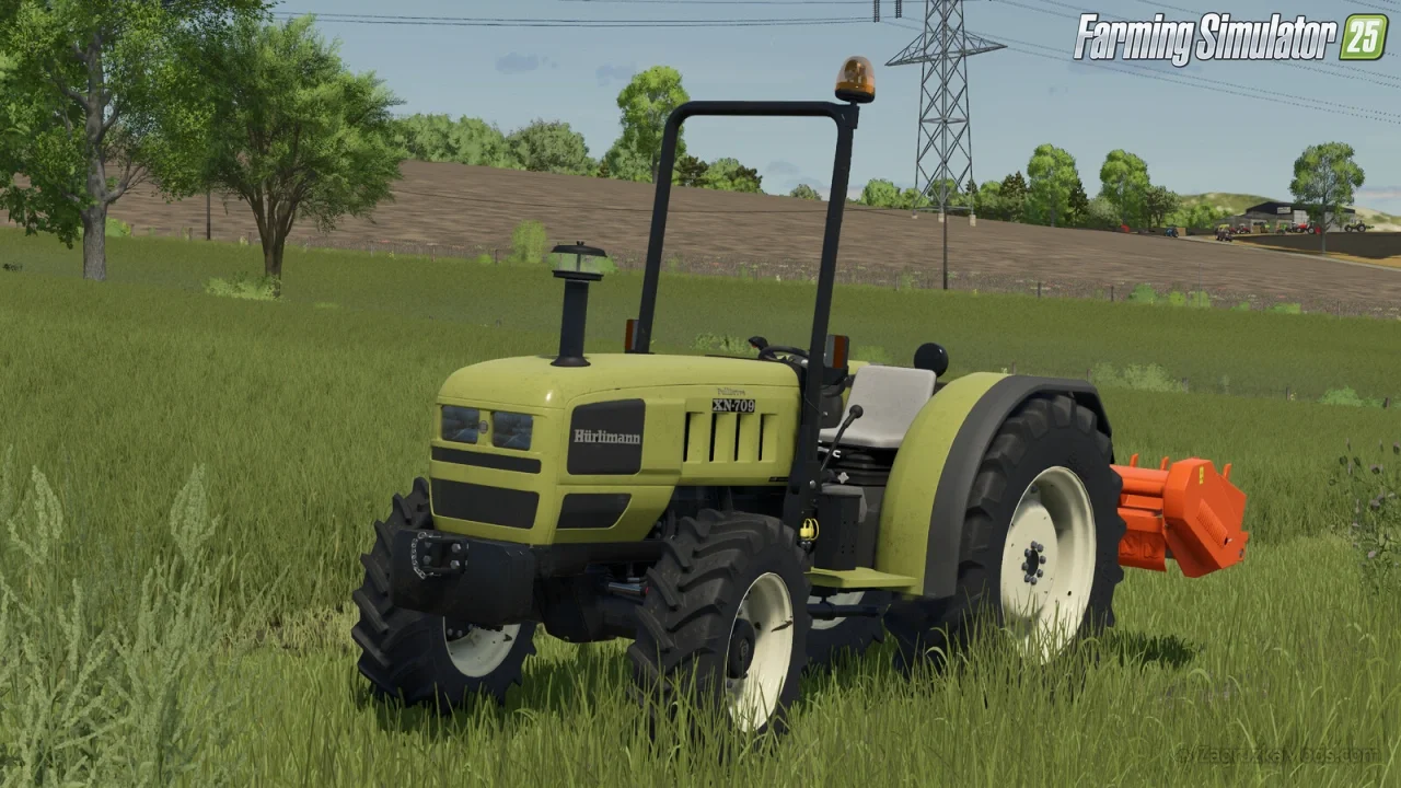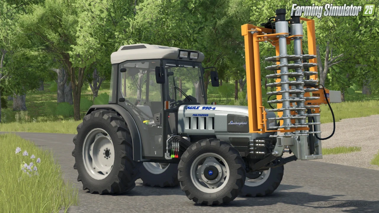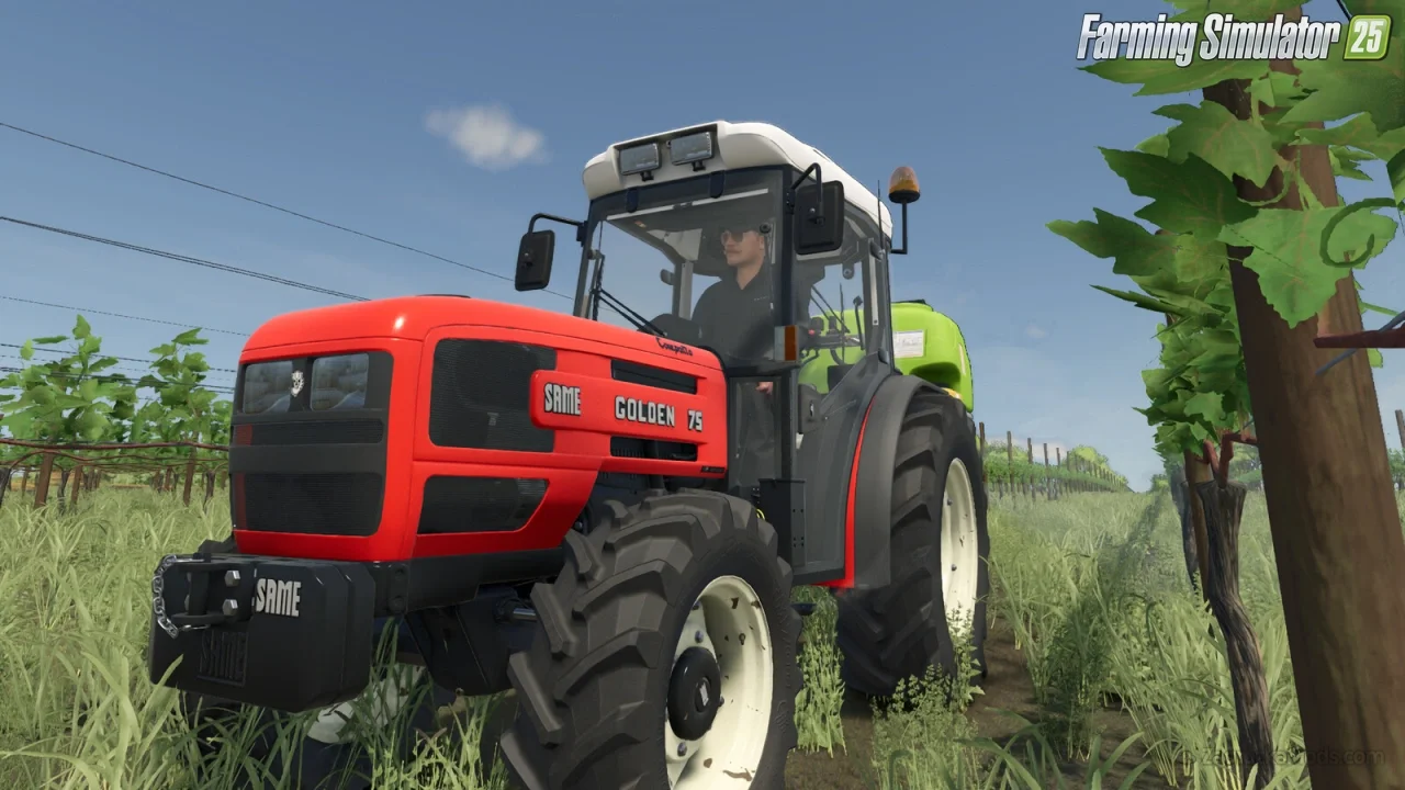 SDF Vineyard Pack Tractor for FS25 - contains four ranges of vineyard tractor from the four main tractor brands owned by the SAME Deutz-Fahr group and a front loader made by the portuguese brand Agriduarte with it's respective implements. The ranges included are the Same Golden, the Lamborghini AGILE, the Huerlimann XN and the Deutz-Fahr AgroCompact. The Agriduarte M2 front loader can be attached to any model mentioned above and has four different implements, including two bucket shovels, one set of pallet forks and one set of bale forks.